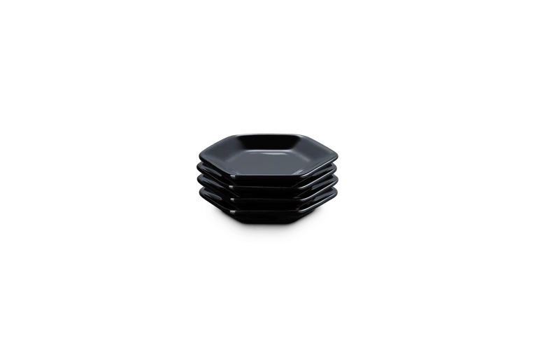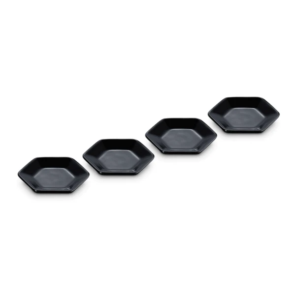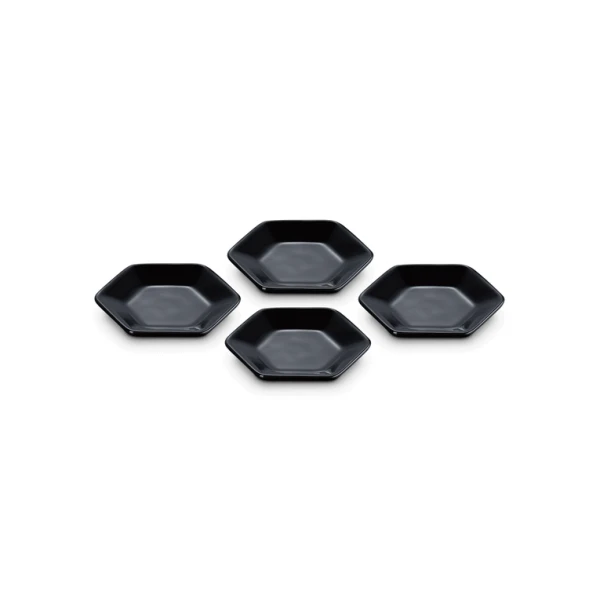 De vier Le Creuset serveerschaaltjes zijn gemaakt van geglazuurd aardewerk, uitgevoerd in zwart. De schaaltjes zijn 8,5 cm breed, 9,5 cm lang en 1,5 cm hoog. Gebruik om (dip)sauzen te serveren.