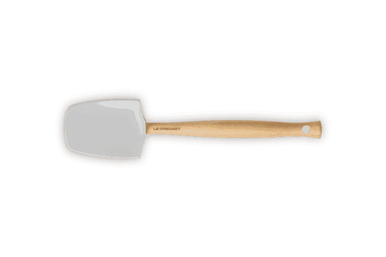 De grijze Le Creuset grote spatel is gemaakt van hout en heeft een siliconen blad, waardoor de spatel niet krast. De spatel heeft een platte en bolle zijde en heeft een lengte van 28 cm. De breedte van het blad is 7 cm.