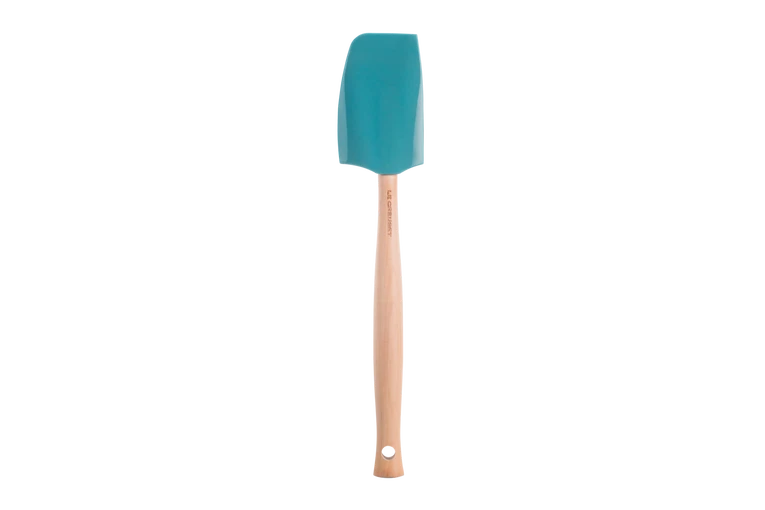 De Le Creuset Premium Medium spatel is gemaakt van hout en heeft een Caribbean blauwe siliconen blad, waardoor de spatel niet krast. De spatel heeft een platte en bolle zijde en heeft een lengte van 28,5 cm. De breedte van het blad is 5,8 cm.