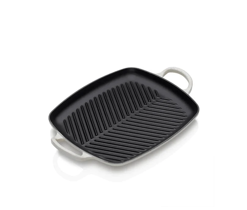 Deze Le Creuset rechthoekige grill heeft twee handgrepen. De pan is gemaakt van Meringue, crèmekleurig, geëmailleerd gietijzer. De grillpan is 30 cm lang, met grepen 39 cm en 27 cm breed. Gebruik de grillpan voor het grillen van vis, vlees en groenten.