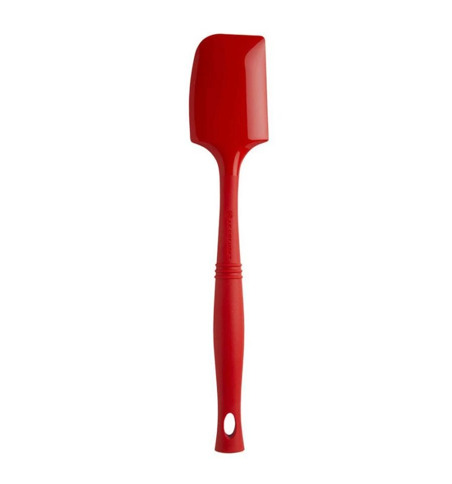De kersrode Le Creuset spatel is gemaakt van silicone, waardoor de spatel niet krast. De spatel heeft een platte en bolle zijde en heeft een lengte van 32 cm. De lengte van het blad is 10 cm en de breedte 5 cm.